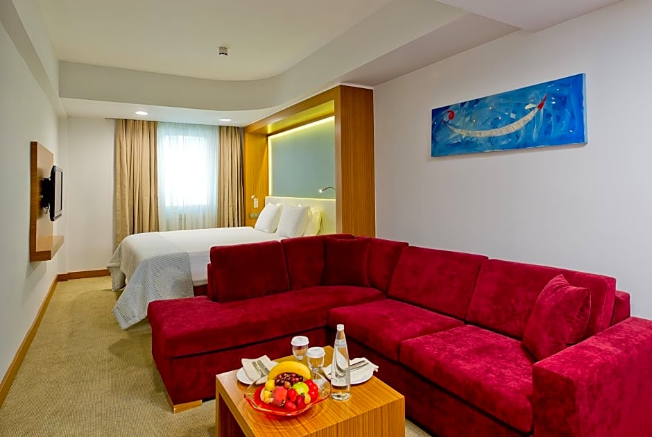 Features a sitting room, dining room, and a kitchenette. It has a work desk, a mini-bar, and tea and coffee making facilities.